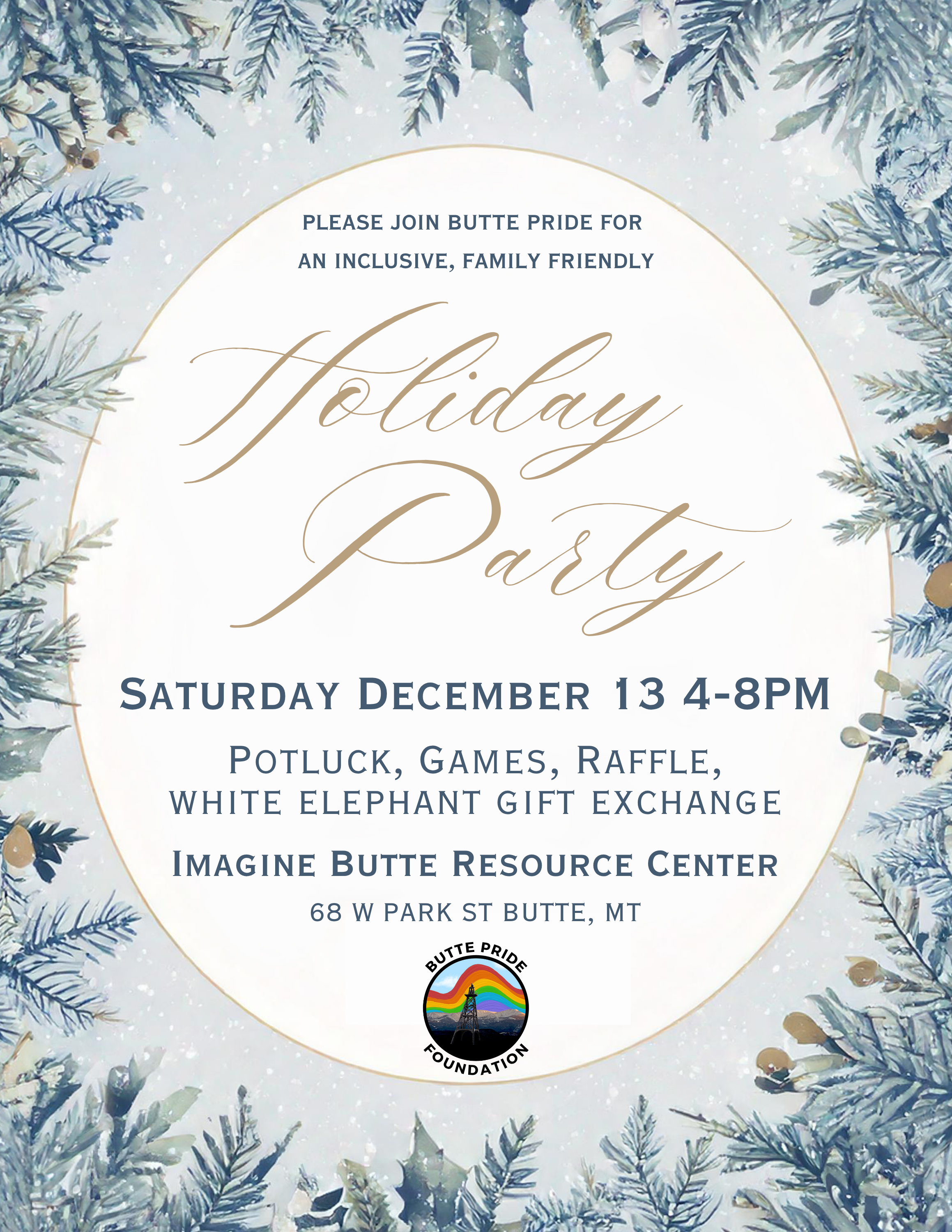 Join us for a family friendly, inclusive holiday party at the Imagine Butte Resource Center on December 13th from 4-8PM! We will have food, games, and fun for everyone! If you would like to bring a dish for potluck, please have a list of ALL ingredients. We will also have a white elephant gift exchange, but you are NOT required to bring anything to come. You will also have the chance to enter a raffle to win a homemade rainbow gingerbread house! Hope to see you there!